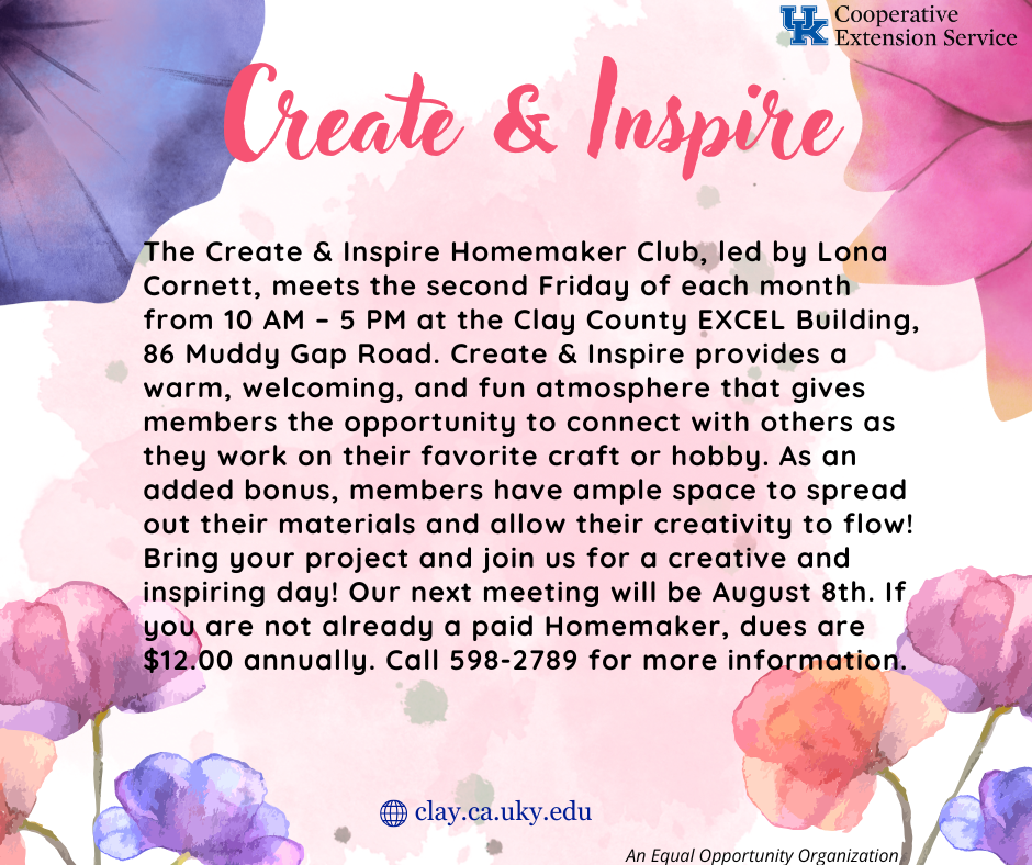 The Create & Inspire Homemaker Club, led by Lona Cornett, meets the second Friday of each month from 10 AM – 5 PM at the Clay County EXCEL Building, 86 Muddy Gap Road. Create & Inspire provides a warm, welcoming, and fun atmosphere that gives members the opportunity to connect with others as they work on their favorite craft or hobby. As an added bonus, members have ample space to spread out their materials and allow their creativity to flow! Bring your project and join us for a creative and inspiring day! Our next meeting will be August 8th. If you are not already a paid Homemaker, dues are $12.00 annually. Call (606) 598-2789 for more information.