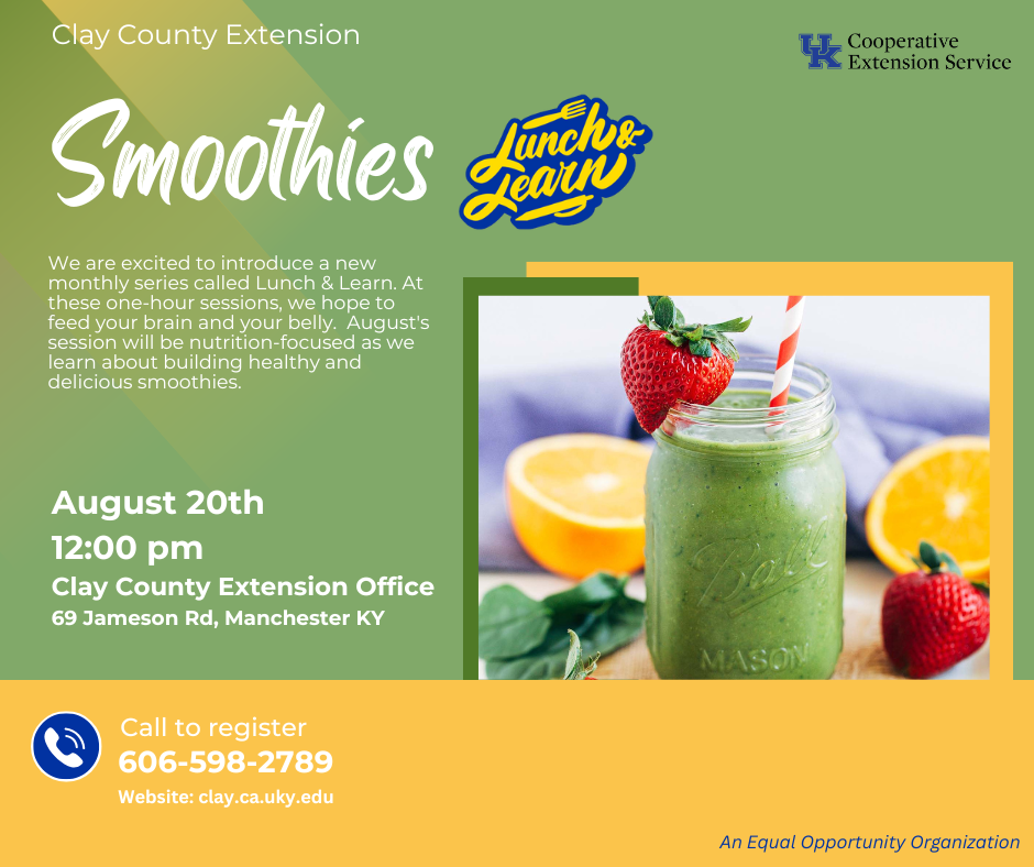 Join us on August 20th at 12:00 PM at the Clay County Extension Office, 69 Jameson Rd, Manchester, KY 40962. Please call (606) 598-2789 to register.